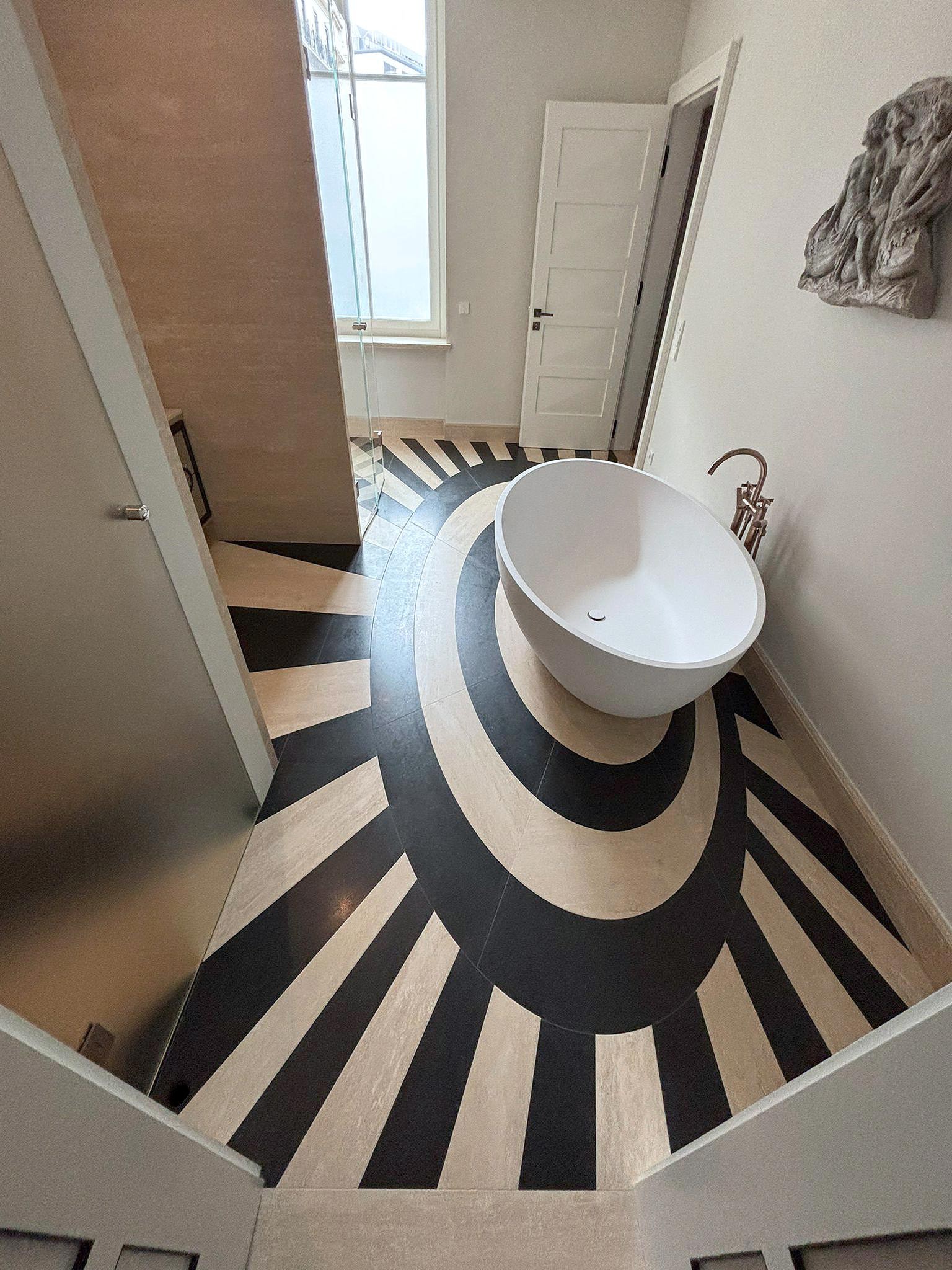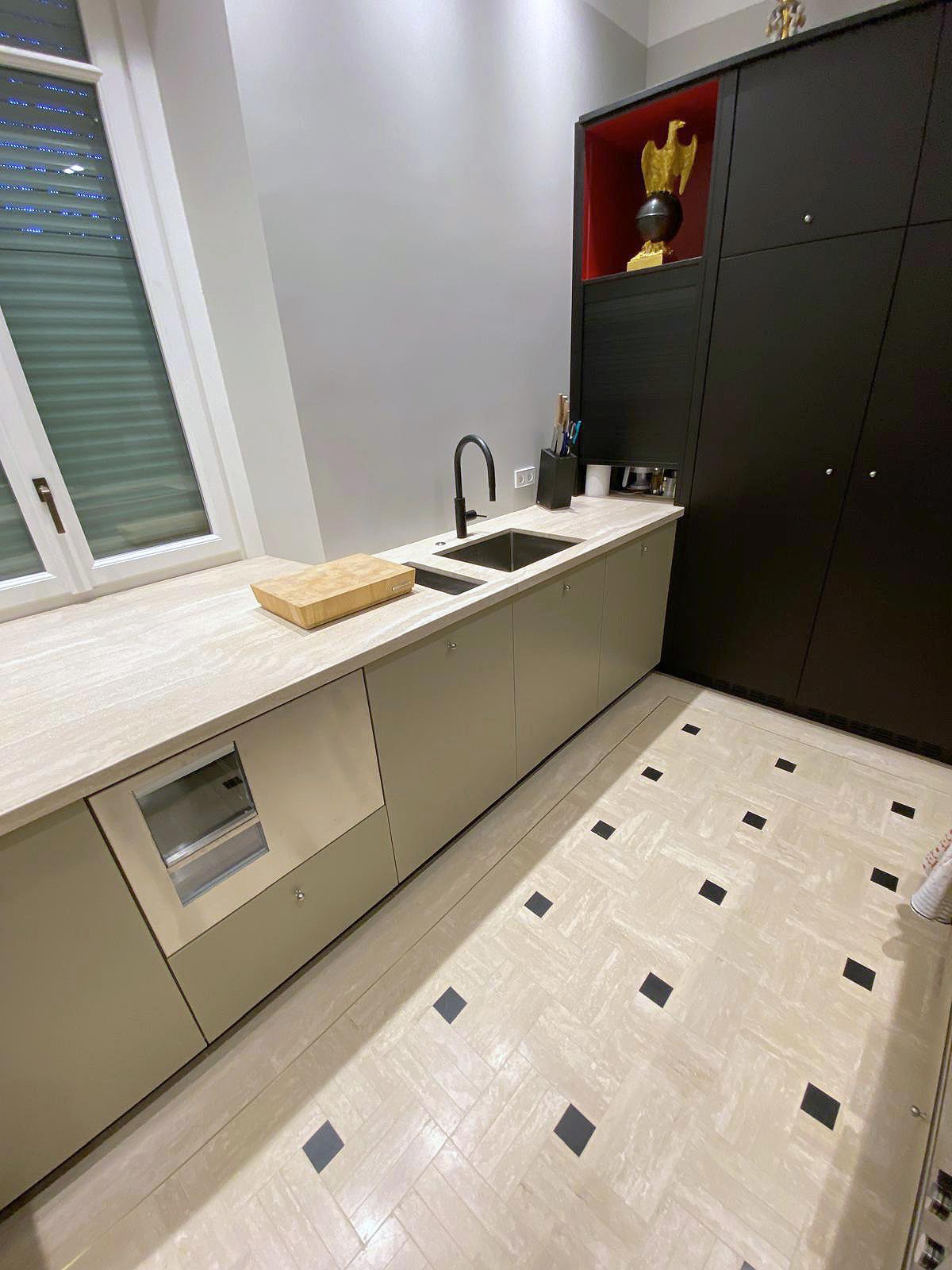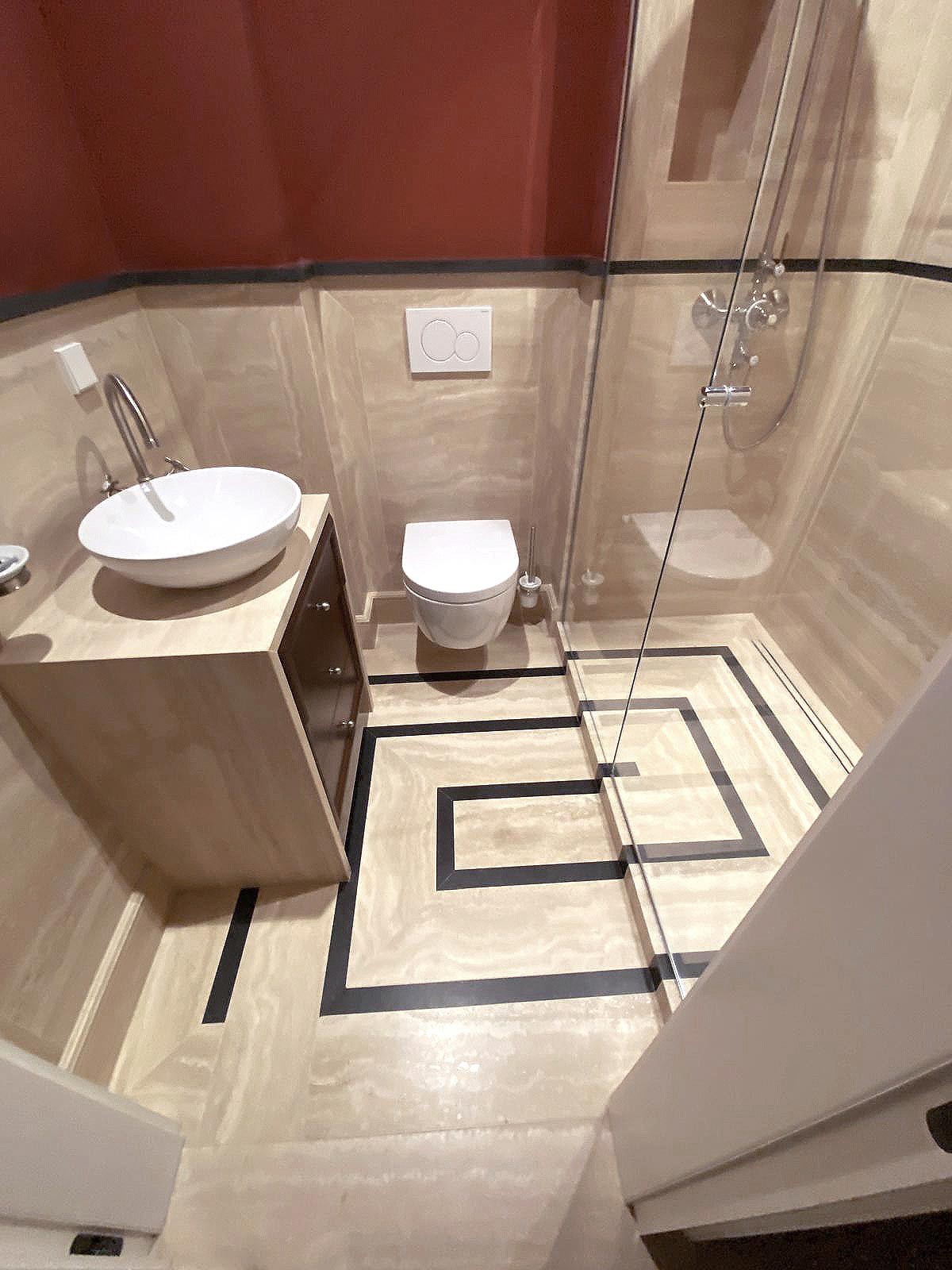 Questo intervento rappresenta un perfetto equilibrio tra tradizione e innovazione: il travertino, materiale antico per eccellenza, viene reinterpretato in chiave contemporanea attraverso una posa precisa e un’estetica pulita, che valorizza volumi e geometrie con eleganza senza tempo.