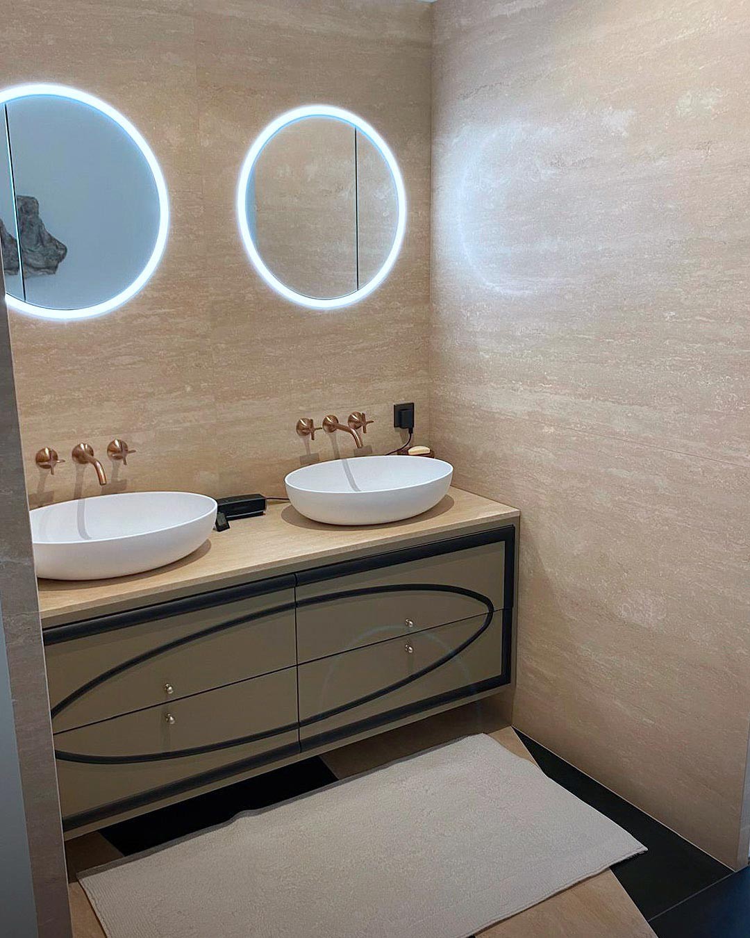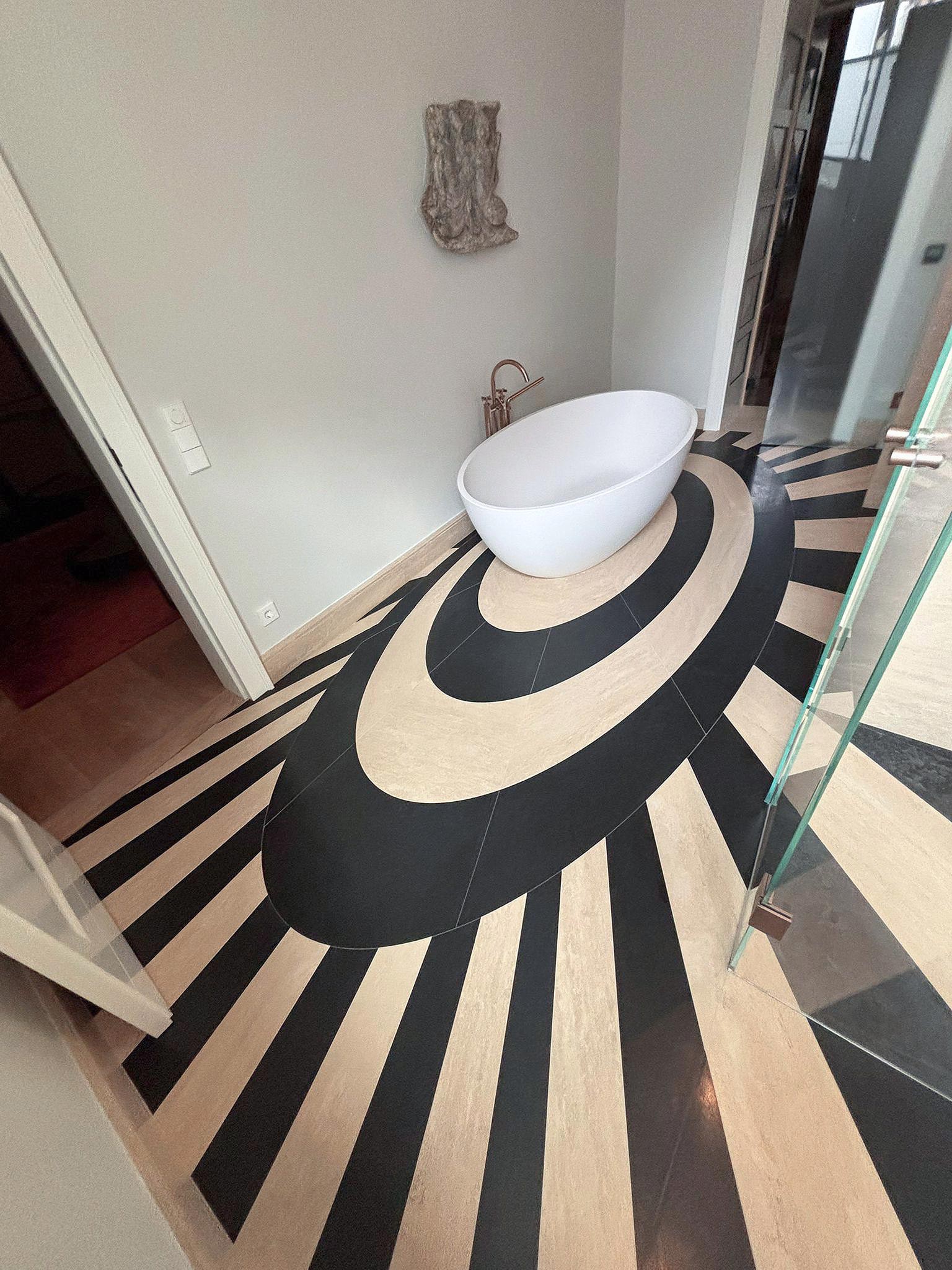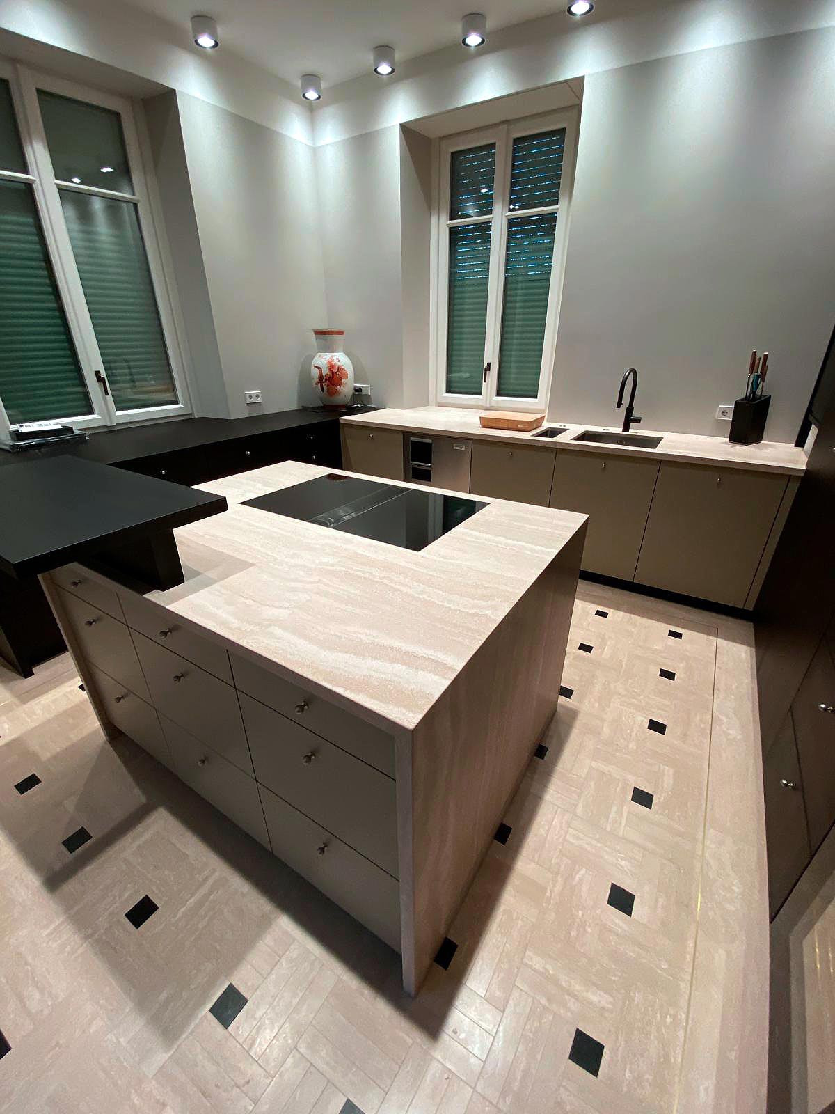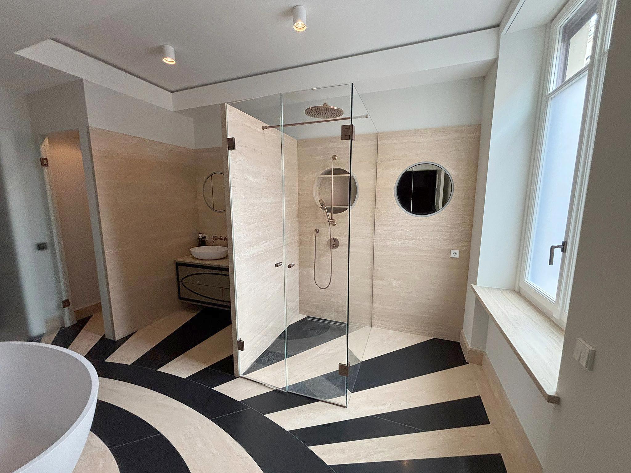 Questo intervento rappresenta un perfetto equilibrio tra tradizione e innovazione: il travertino, materiale antico per eccellenza, viene reinterpretato in chiave contemporanea attraverso una posa precisa e un’estetica pulita, che valorizza volumi e geometrie con eleganza senza tempo.