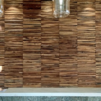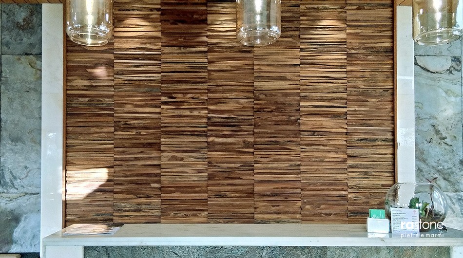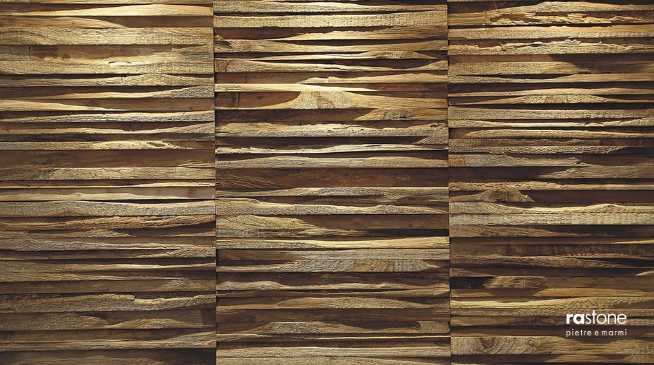 L'ondulatoria irregolarità delle pareti rivestite in legno Teak NEMESI trasmette all'ambiente circostante un'armonia perfetta, nella quale immergersi ogni giorno.
